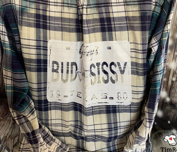 Custom bleached flannel - country western - Bud & Sissy tag in white screenprint transfer pressed on back. This is a men's Large Tall. Northcrest Brand