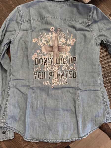 Custom jean shirt with a colorful dtf pressed on the back. Shirt is much bluer than the pic. It's a Tommy Hilfiger ladies size XS fitted.