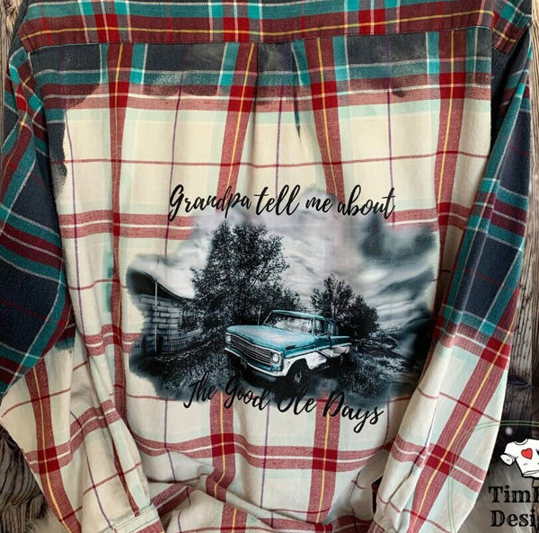 Custom bleached flannel/plaid - Grandpa - Country Western - Colorful dtf (direct to film) transfer pressed on back. This is a men's size XL. Brand is Stanley Blacker.