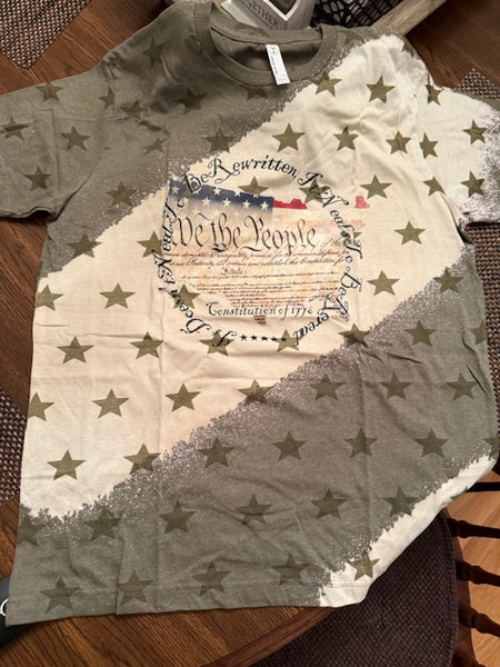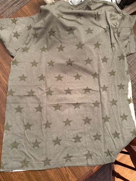 Beautiful full-color screenprint transfer pressed on a green star-bleached Code 5 tee Size large