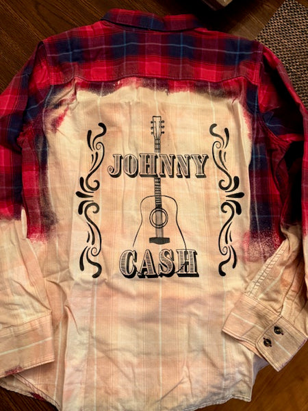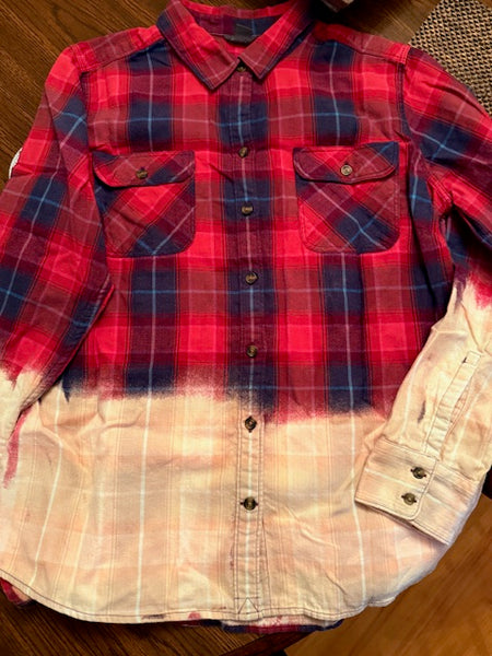 Custom bleached flannel with a screen print transfer pressed on the back. Brand is an Eddie Bauer Ladies size large.