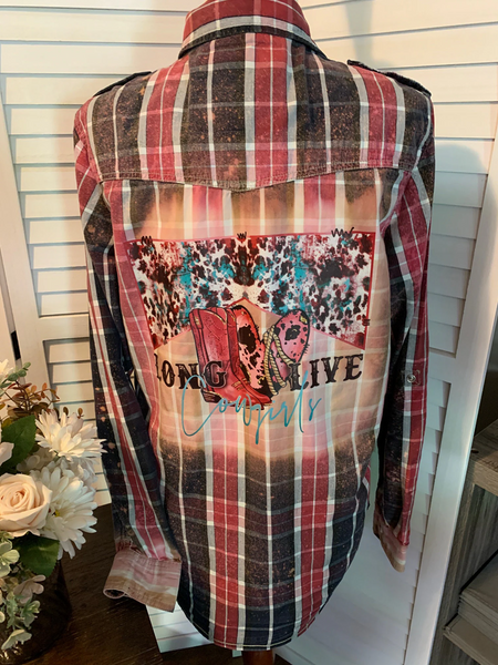 Custom bleached plaid-western shirt. Colorful dtf design pressed on the back. Long Live Cowgirls. Pearl snap buttons. This is a unique and one-of-a-kind shirt. Ladies' size medium. Supply Co. USA brand. Not available in any other size.