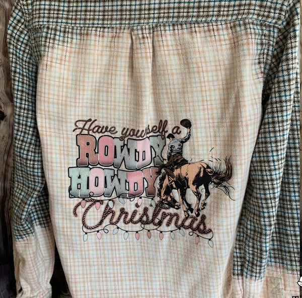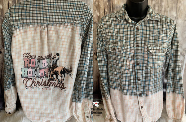Custom bleached flannel with a colorful Western-Cowboy Christmas design pressed on the back. This shirt is a size mens' Small and is nice and thick for cold weather. Brand is Mossimo Supply.