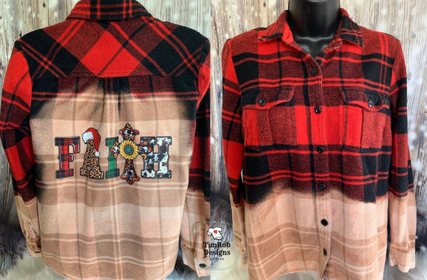 Custom bleached flannel with a colorful dtf (direct to film) transfer pressed on the back. FAITH spelled with country/western colors and designs. This is a ladie's size Small. Old Navy brand. Great thick flannel for cold weather.