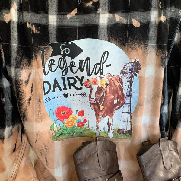 Custom bleached flannel with a colorful cow design pressed on the back. Size is a Men's XXL in the Arizona Jeans Co. Brand.