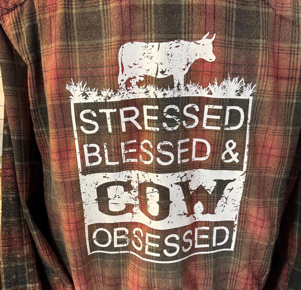 Custom bleached flannel with a screen print transfer pressed on back. Flannel is lightly bleached so there is only a subtle change in colors of the shirt. This is a mens size XL. Brand is Burnside. Dark colors are a mixture of black/green and then dark reds. Material stays crumpled/wrinkled slightly. Gives it a more textured look.