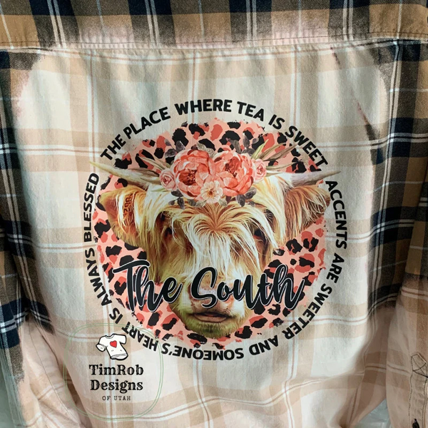 Custom bleached flannel with a colorful design pressed on back. The South - The place where tea is sweet, accents are sweeter, and someone's heart is always blessed. Dtf (direct to film) transfer pressed on back. This is a men's XL and would fit a lady as a roomy XL or as a ladies' 2X. Brand is Divided, H&M.
