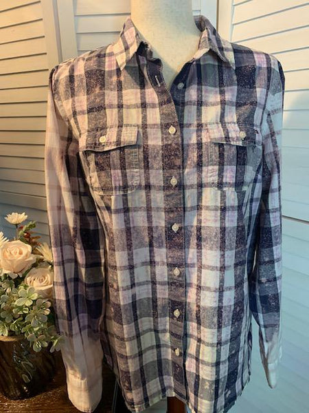 Flannels/plaids are bleached for a vintage/distressed look. They can sometimes have small holes, slits, fraying as part of the look/process. For a larger, top-layer shirt, order one size up or a men's size in your size. For a fitted or to wear alone, order same size or one size lower in men's size. Please read description carefully for any detailed info on sizing.